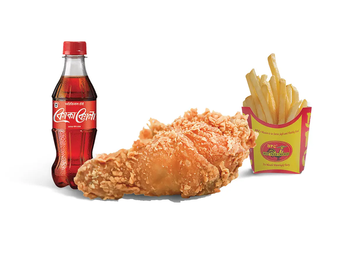 Consists of 1 pc crispy fried chicken, 1 large french fries & 1 bottle of 250 ml drinks